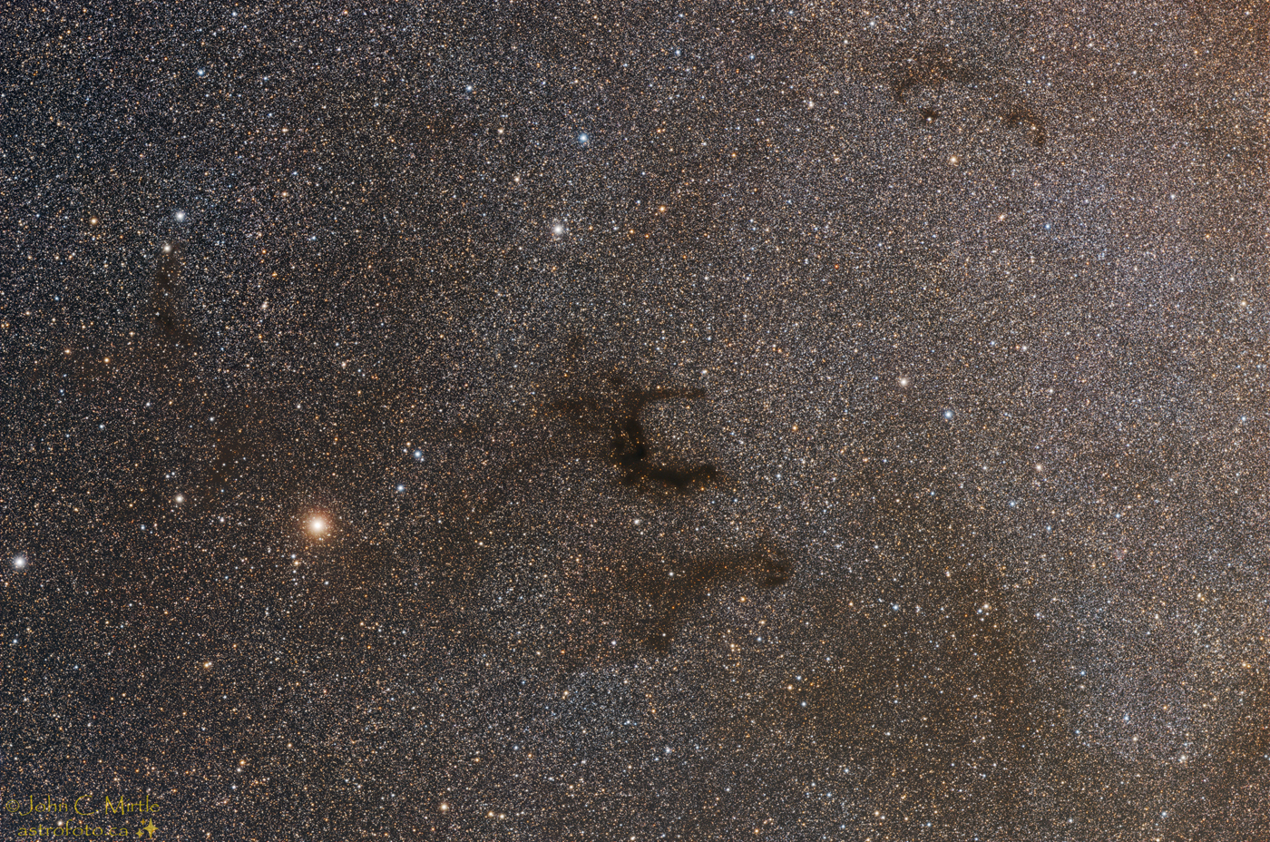 "Barnard's E" due to the distinctive shape of these nebula. The smaller dark nebula in the upper right are Barnards 334, 336 and 337. The