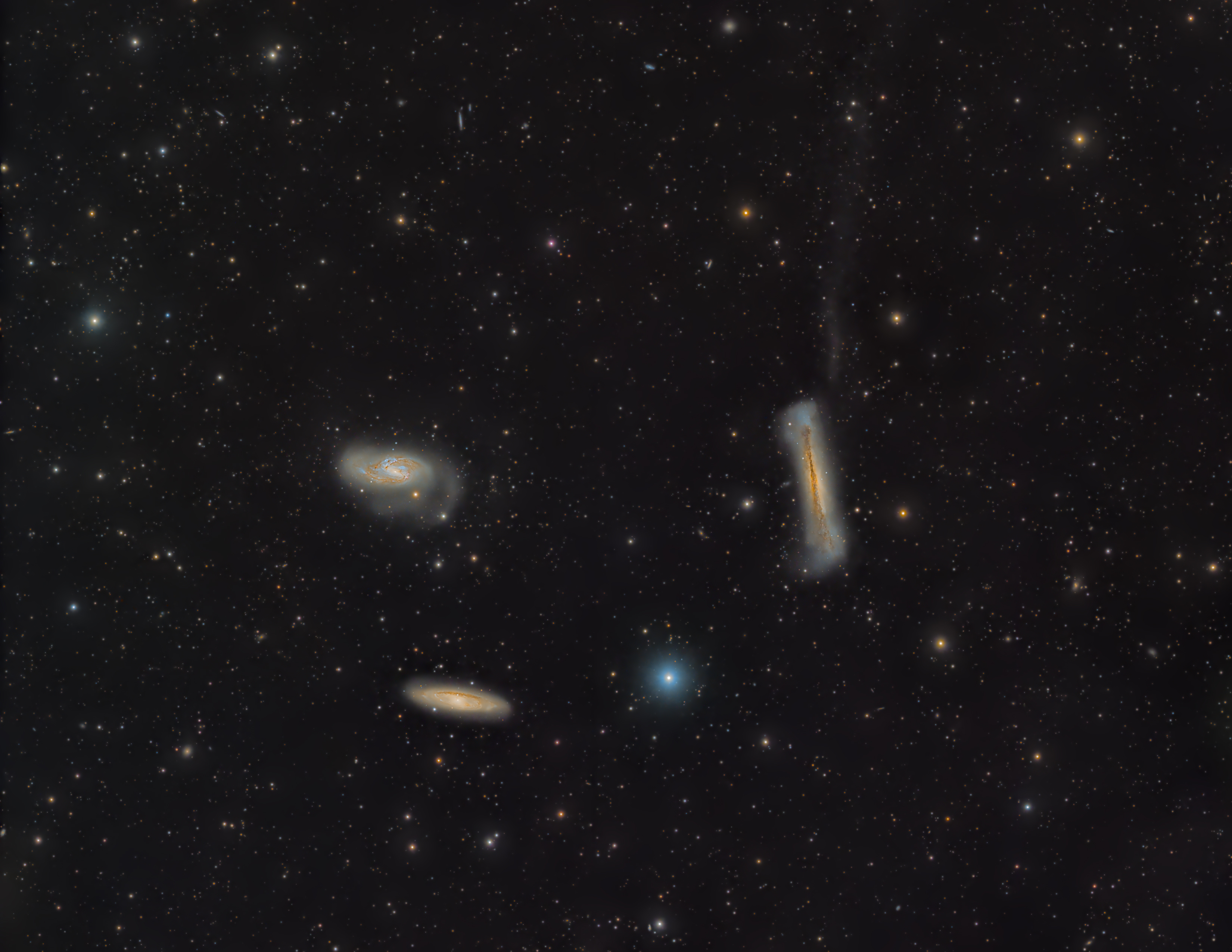NGC3628, on the right, is an edge-on sprial galaxy 14x4.0 arcminutes in