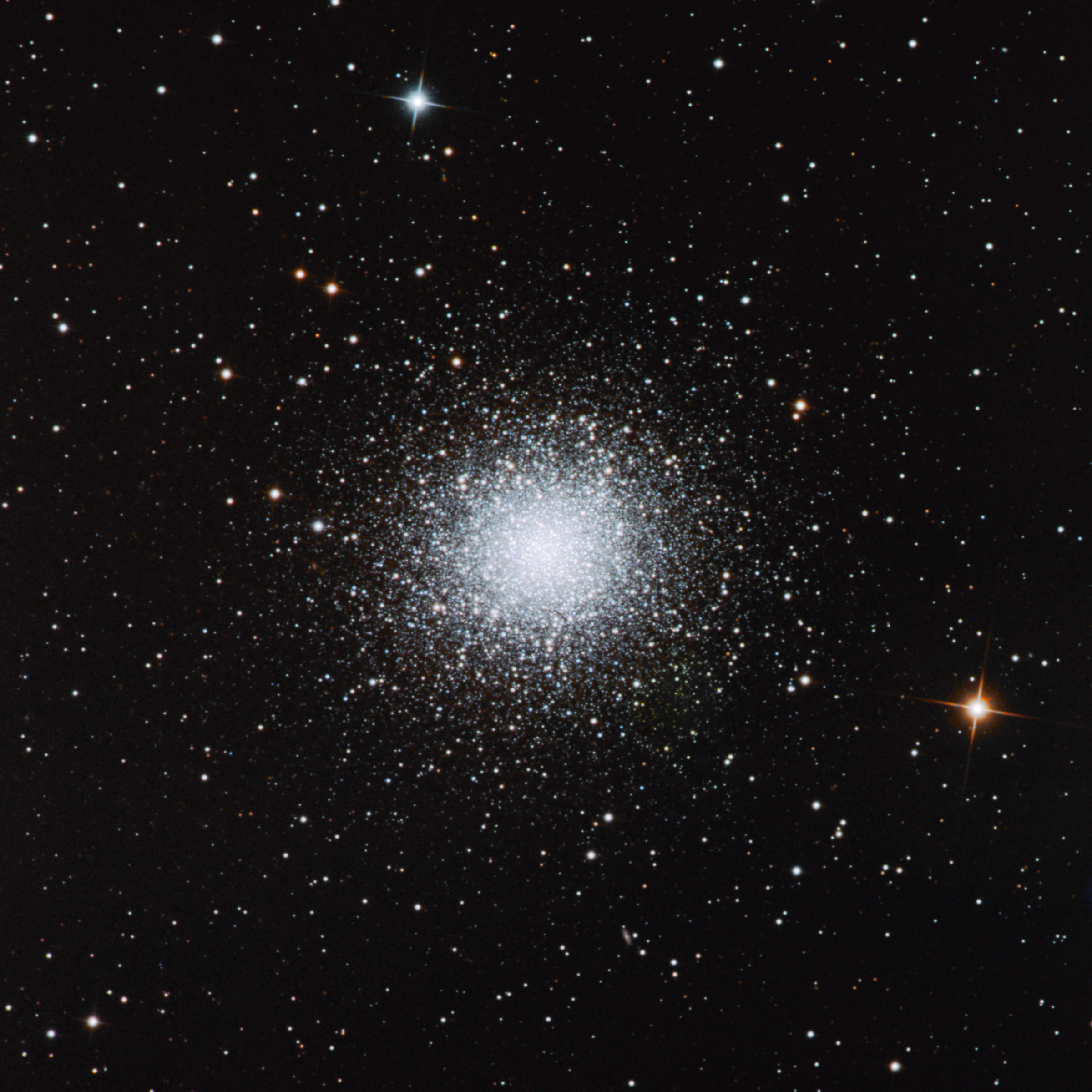 M13, also called the `Great globular cluster in Hercules', is one of the most prominent and best known globulars of the Northern celestial hemisphere. It was discovered by Edmond Halley in 1714, who noted that `it shows itself to the naked eye when the sky is serene and the Moon absent.' According to Charles Messier, who cataloged it on June 1, 1764, it is also reported in John Bevis' "English" Celestial Atlas.