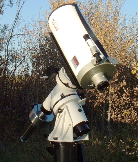 Wow, this has been a long list! In 1987 I acquired an Olympus OM1 and lenses as my primary astro camera. Around that time I also bought a Canda Technologies cold camera. This device used dry ice to cool the film to about -40C to improve film performance and colour balance. There are a few examples of how well this device worked scattered throughout the photo collections on this website. Most film images were taken with the OM1 or the later addition - the OM2. In 1992 I added an 8" f1.5 Schmidt camera to the collection. This photographic telescope bent film into a convex shape and brought wide field, high resolution images to the fold. With this camera I used primarily Kodak hypersensitized Tech Pan 2415 film. This camera filled the gap between camera lenses and prime focus with telescopes nicely. There are image examples scattered throughout the photo galleries on this web site. With a focal ratio of f1.5 this camera was incredibly fast!