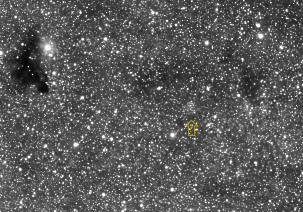 - Description: Open cluster NGC6520 and dark nebula Barnard 86, Very low in the sky and difficult to