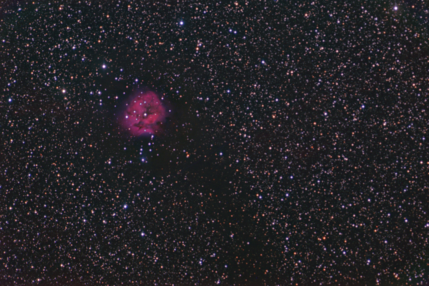 This popular target for astro-imagers is shown here in a very widefield depiction. Note the dust lane running down and to the right from the nebula. IC5146 is actually the designation of the open cluster associated with the nebula but the stars of the open cluster, embedded in the nebula, are very faint so difficult to see at this image scale. The dark lane mentioned above is designated B168.
