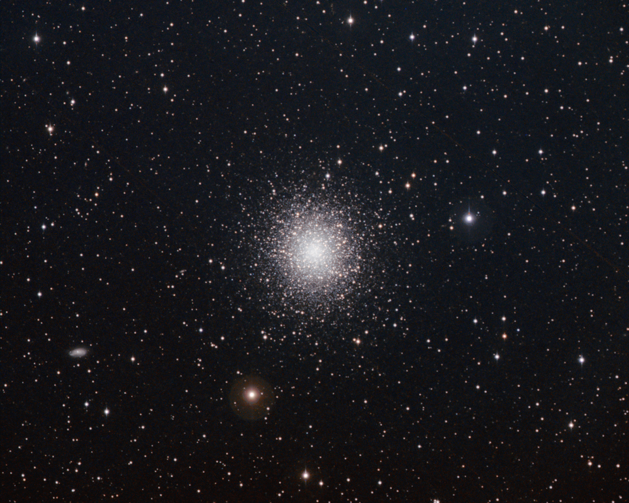 M13, also called the `Great globular cluster in Hercules', is one of the most prominent and best known globulars of the Northern celestial hemisphere. It was discovered by Edmond Halley in 1714, who noted that `it shows itself to the naked eye when the sky is serene and the Moon absent.' According to Charles Messier, who cataloged it on June 1, 1764, it is also reported in John Bevis' "English" Celestial Atlas.