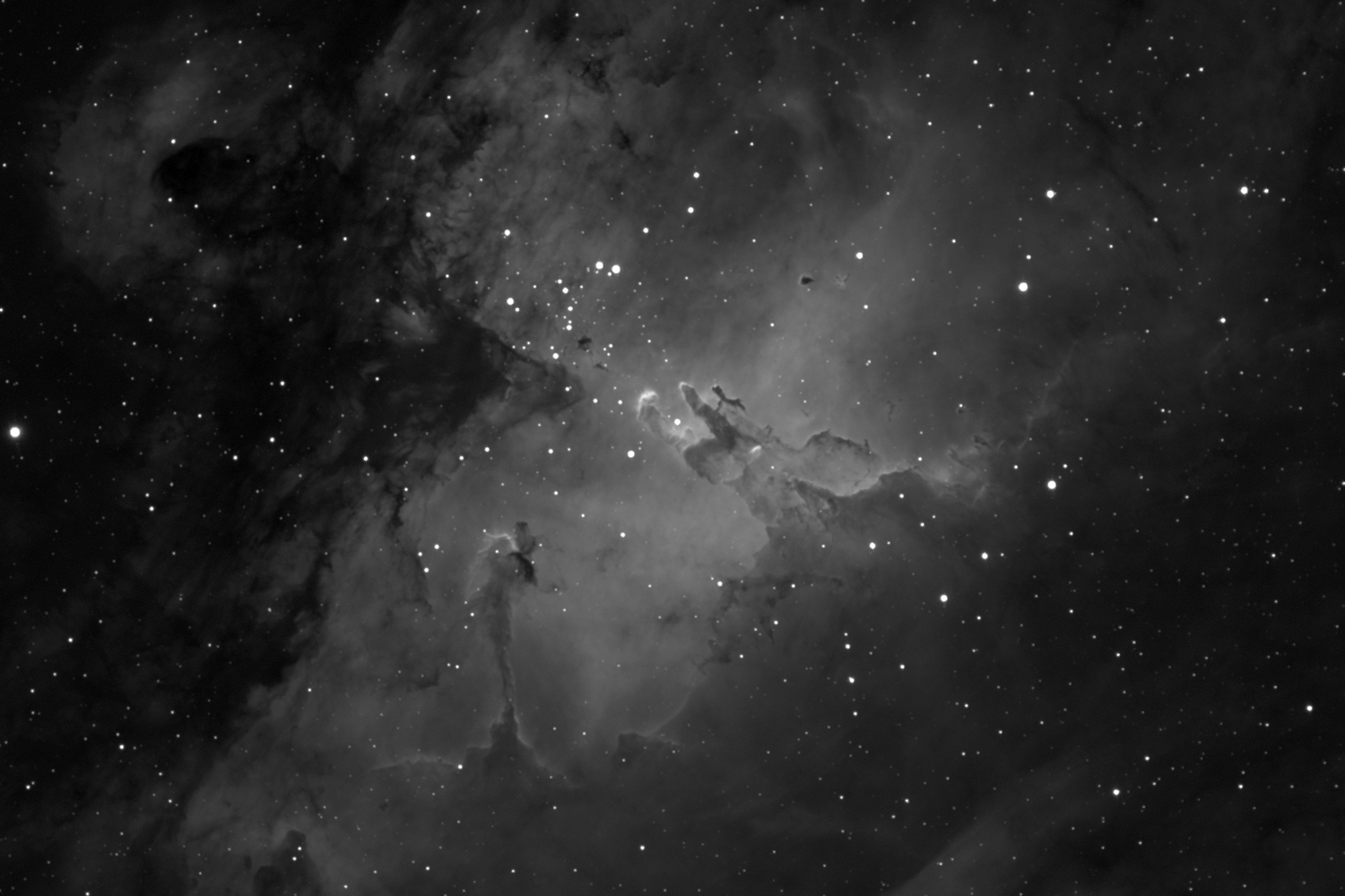 Star cluster M16 and the Eagle Nebula are best seen with low powers in telescopes. A 4-inch reveals about 20 stars in an uneven background of fainter stars and nebulosity; three nebulous concentrations can be glimpsed under good observing conditions. Under very good conditions, suggestions of dark obscuring matter can be seen to the north of the cluster. The Eagle nebula is best seen on photographs, but larger apertures and nebula filters (O-III) may help to trace some detail visually. The dark pillars can be seen in large amateur instruments (12-inch up).