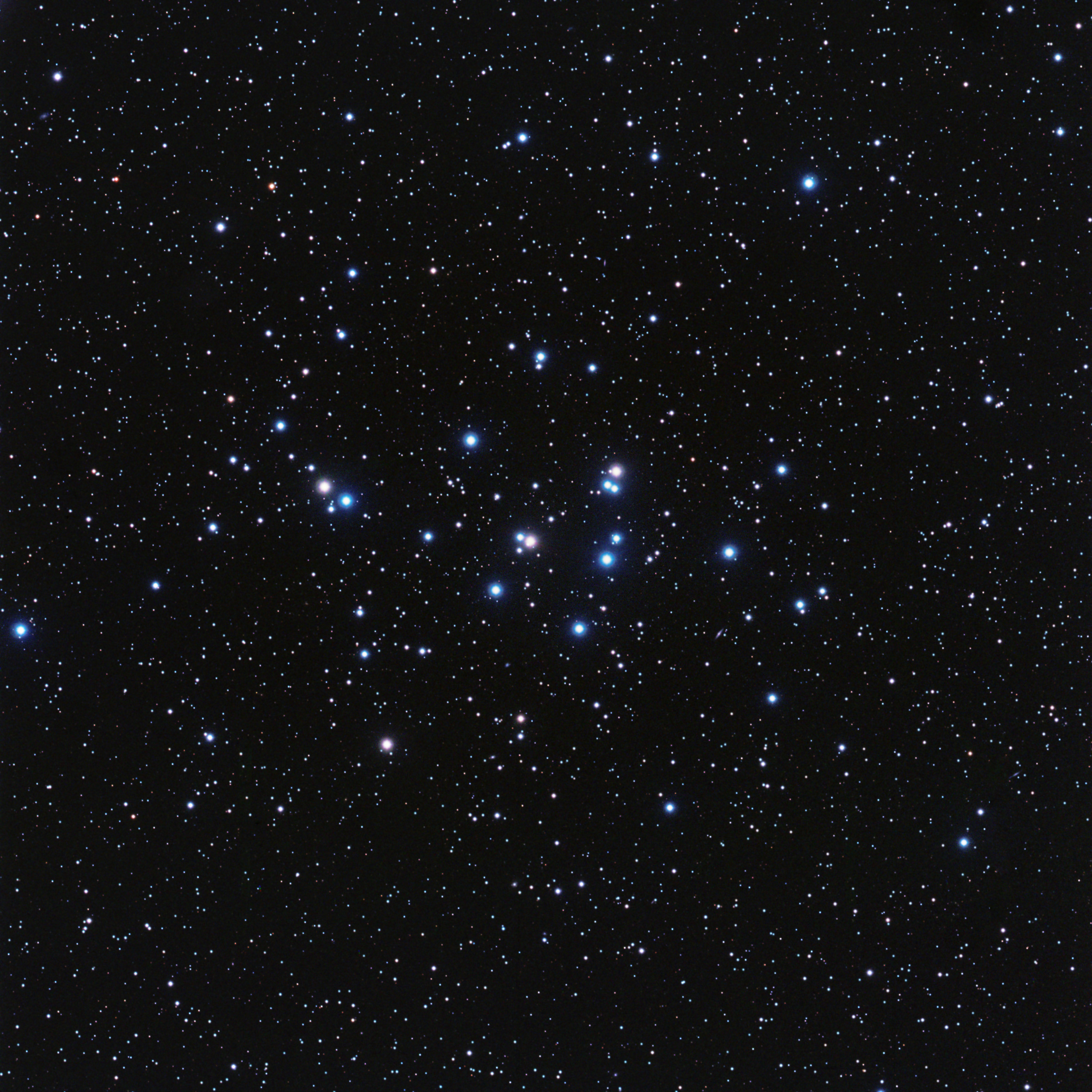 This famous cluster, M44, is also called Praesepe (Latin for "manger"), or the Beehive cluster. It is also one of the objects easily visible to the naked eye, and thus known since prehistoric times. Some ancient lore is associated with it: Greeks and Romans saw this "nebula" as the manger (Greek: Phatne) associated with two asses who eat from it, Asellus Borealis, the Northern Ass (Gamma Cnc, mag 4.7, distance 155 ly) and Asellus Australis, the Southern Ass (Delta Cnc, mag 3.9, distance 155 ly). Erathosthenes reported that these were the asses on which the gods Dionysos and Silenus rode into the battle against the Titans, who were frightened by the animals' braying so that the gods won. As a reward, the asses were put in sky together with Phatne. Aratos (260 B.C.) mentioned this object as "Little Mist", Hipparchus (130 B.C.) included this object in his star catalog and called it "Little Cloud" or "Cloudy Star." Ptolemy mentions it as one of seven "nebulae" he noted in his Almagest, and describes it as "The Nebulous Mass in the Breast (of Cancer)". According to Burnham, it appeared on Johann Bayer's chart (about 1600 A.D.) as "Nubilum" ("Cloudy" Object).