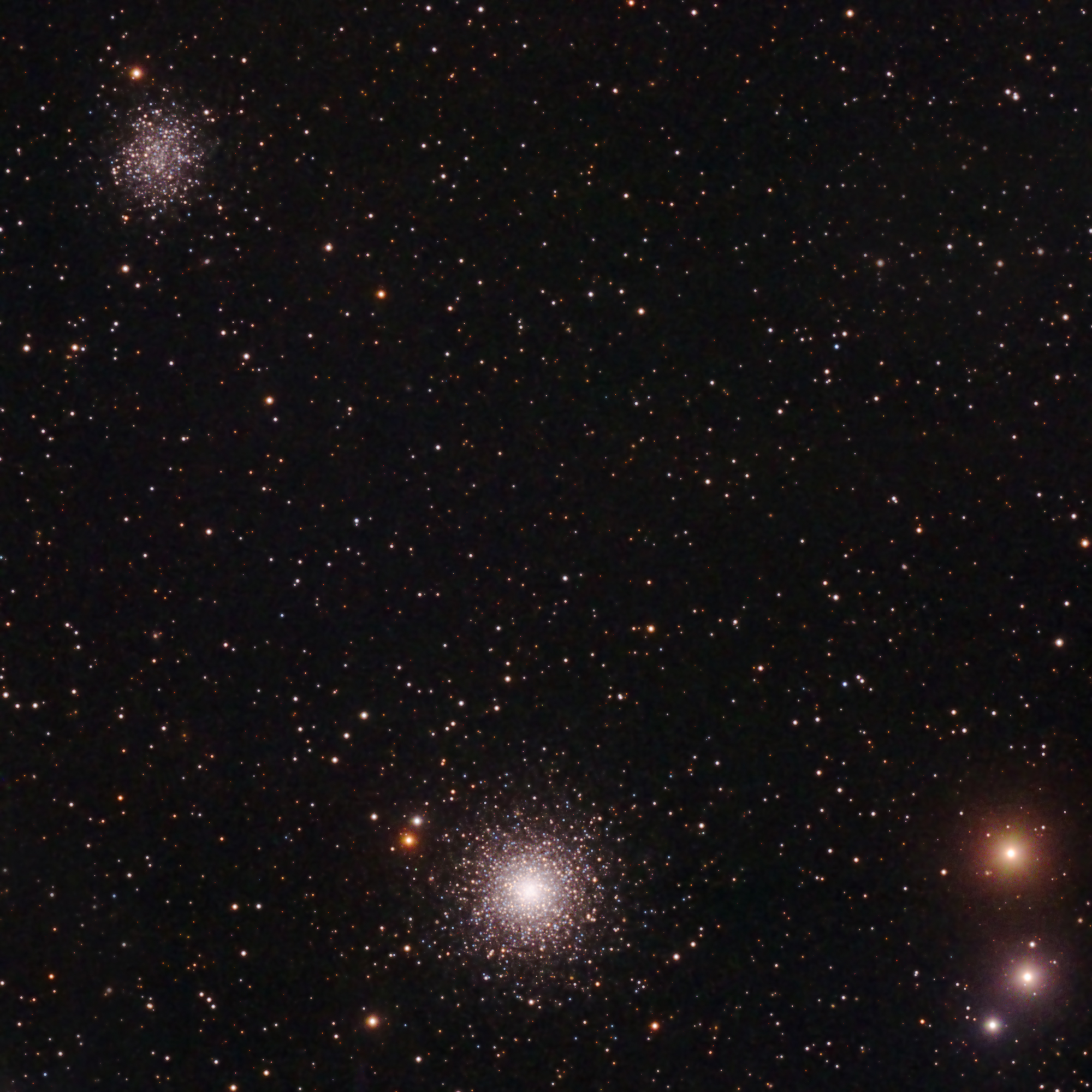 Globular star cluster Messier 53 (M53, NGC 5024), top left in this image, is one of the more outlying globulars, being about 60,000 light years away from the Galactic center, and almost the same distance (about 58,000 light years) from out Solar system. At this distance, its apparent angular diameter of 13' corresponds to a linear diameter of roughly 220 light years. It is rapidly approaching us at a velocity given by Mallas as 112 km/s, by Harris as 79 km/s. M53 has a bright compact central nucleus of about 2' in diameter, although its stars are not very concentrated toward the center when compared to other globulars, and a gradually decreasing density profile to the outer edges.