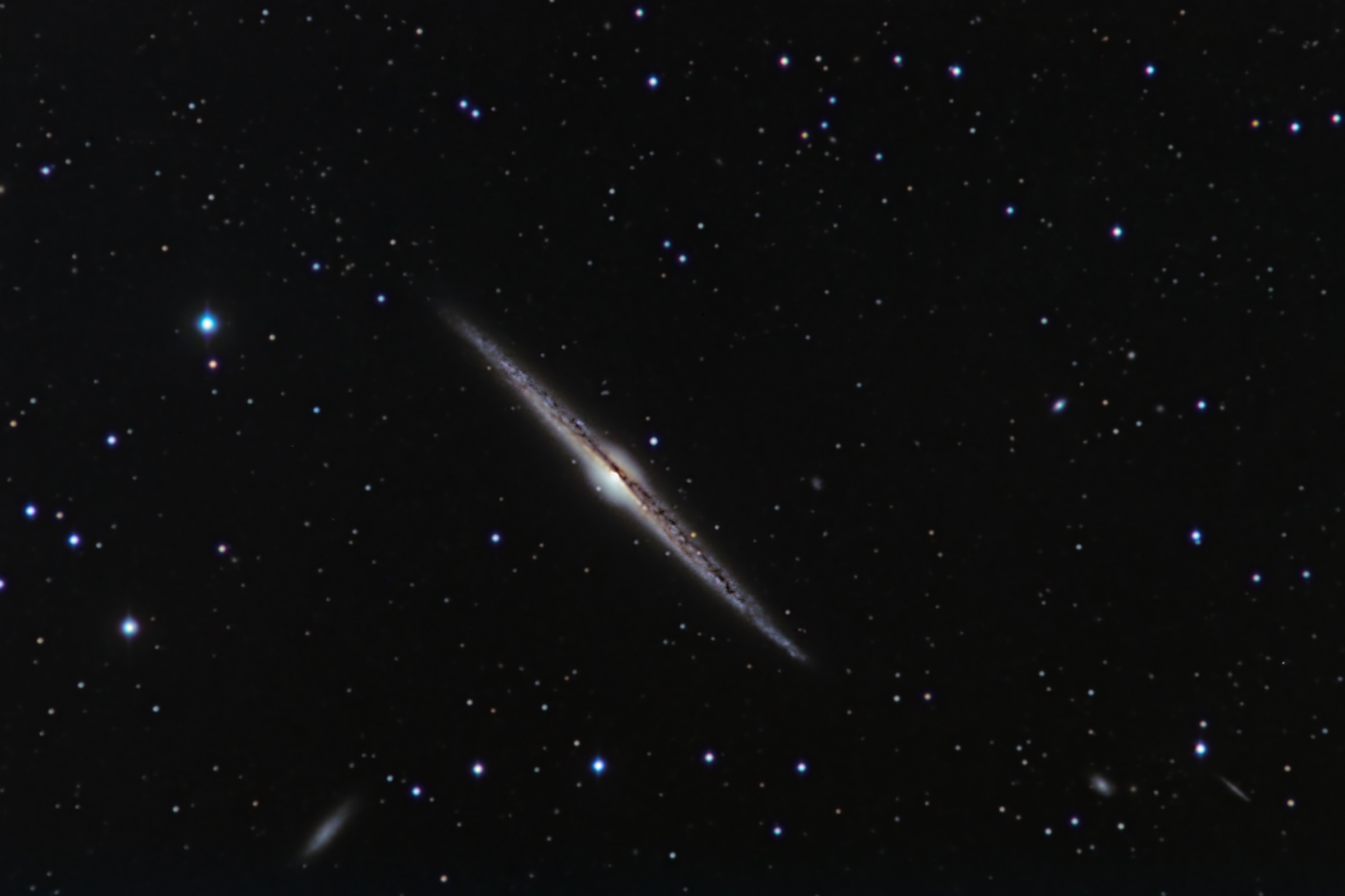 The considerably bright, very large edge-on spiral NGC 4565 is another showpiece for amteurs, and often used in textbooks, as it is assumed that its view may resemble that of our own Milky Way, seen from outside from a place situated near its galactic equatorial plane. NGC 4565 is about 31 million light years distant.